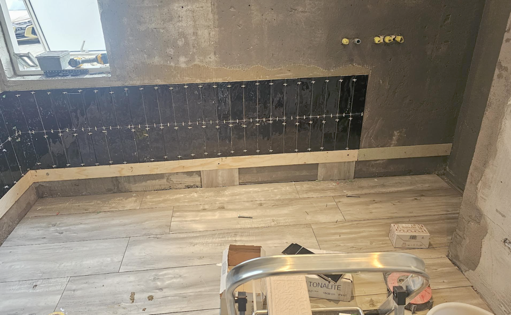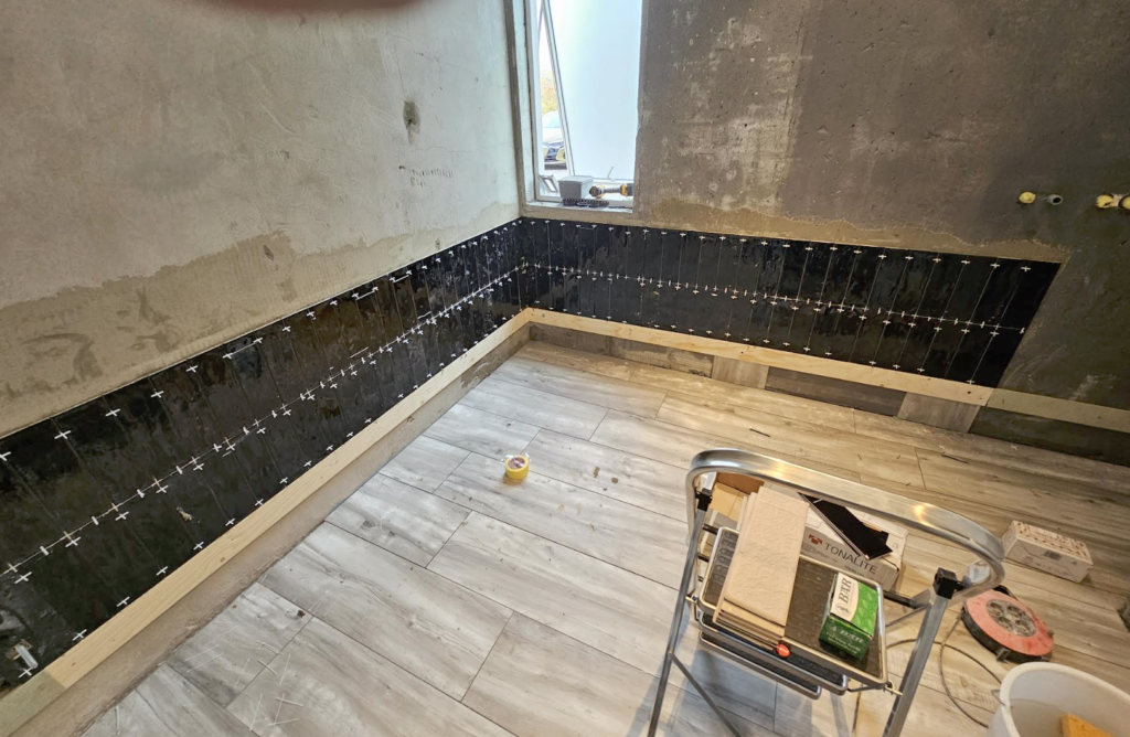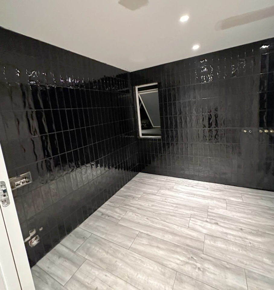 Unnið við baðherbergi – svartar glansandi flísar.